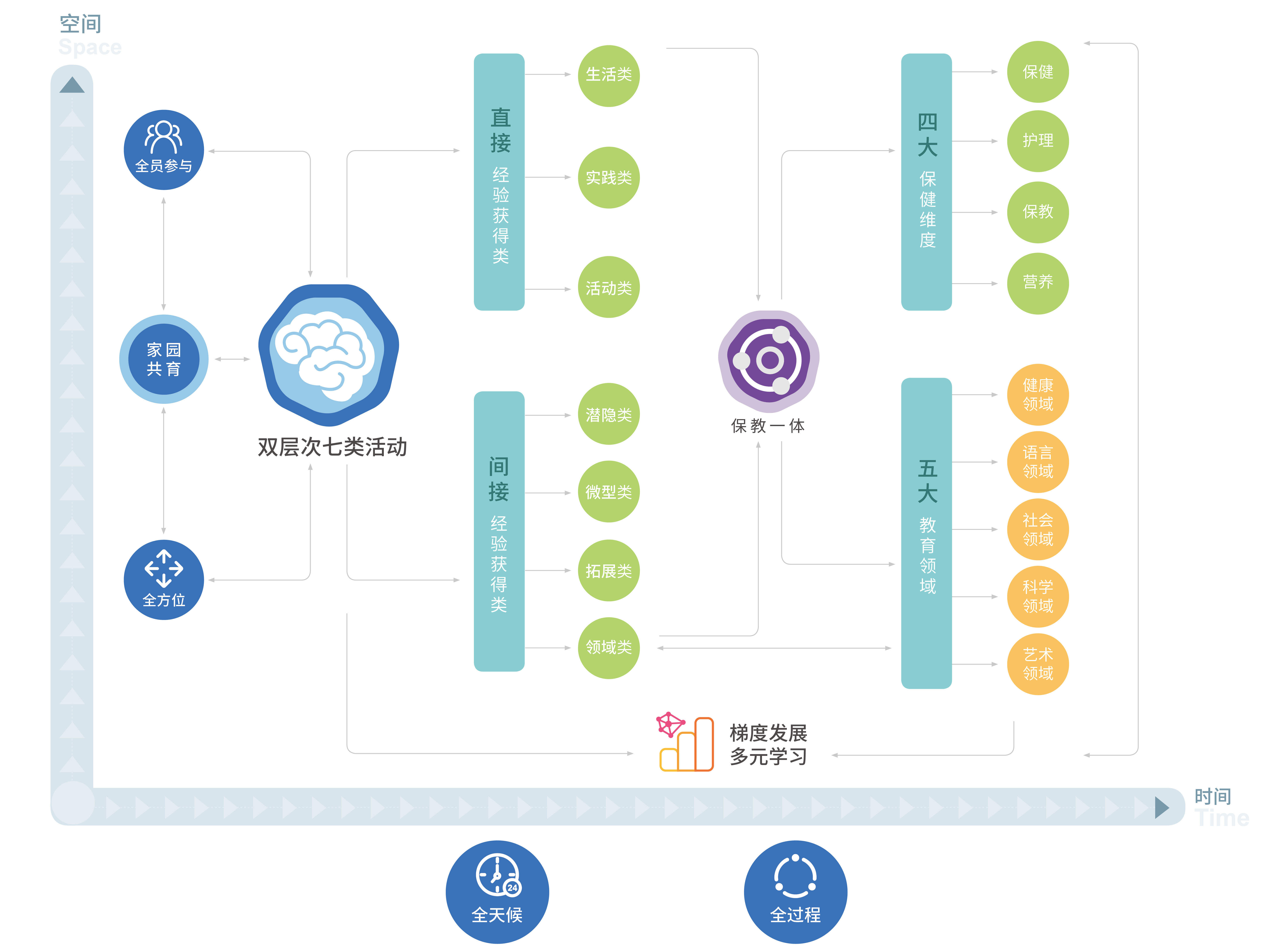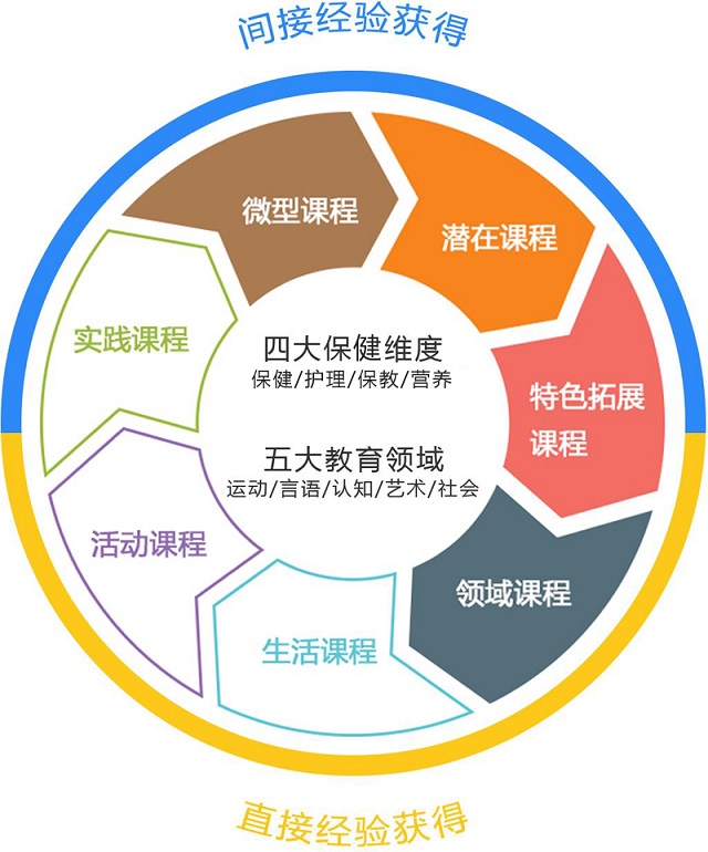 金色摇篮采用的是家园配合下的、全员参与、全方位的双层次七类课程,全天候、全过程覆盖五大教育领域、四大保健维度的保教一体超课程链接模式,促进每一个孩子身心和谐发展,实现面向全体的全面发展,让健康聪明的孩子多起来。